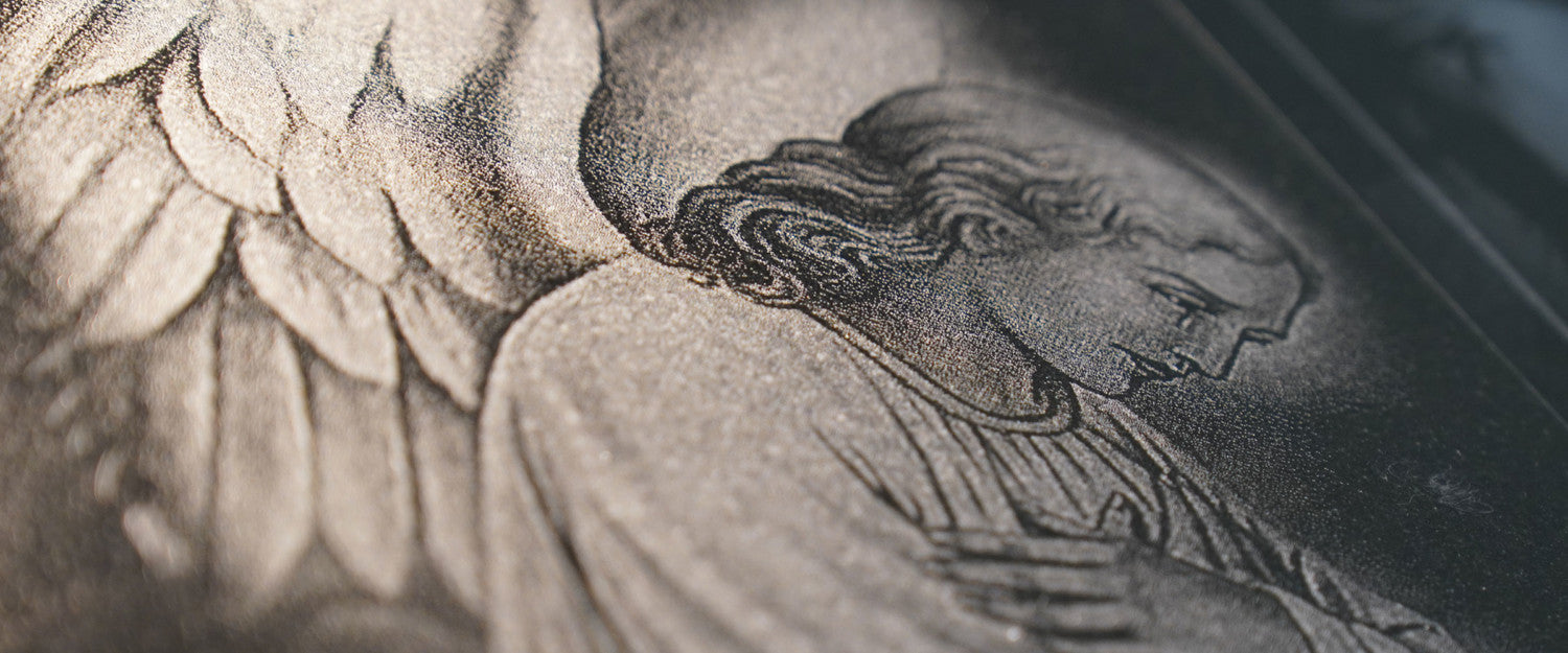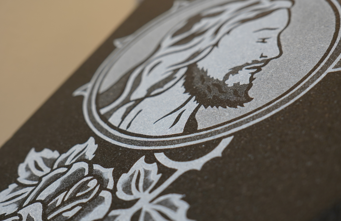 Prairie Flat Memorials uses a traditional practice for engraving called sandblasting. Sandblasting uses a jet of sand driven by compressed air to remove the polish from the granite’s surface. By doing so, it exposes the contrast between the polished surface and the unpolished layers of the granite. Up to four shades or tones can be created on black granite using different sandblasting techniques, which enables the creation of beautiful designs.